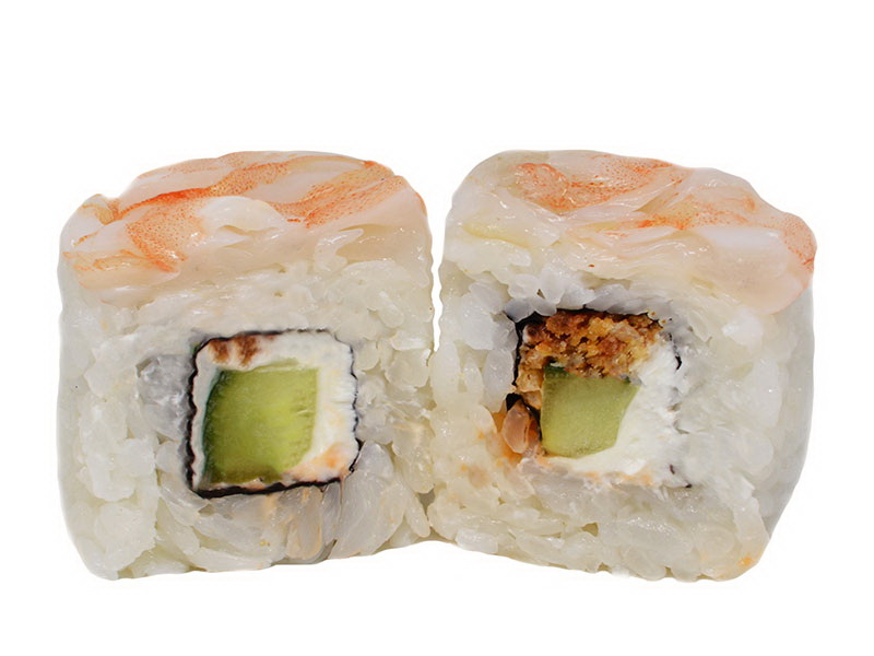 рис, нори, креветка отварная, соус спайс, луковые хлопья, огурцы, сыр
