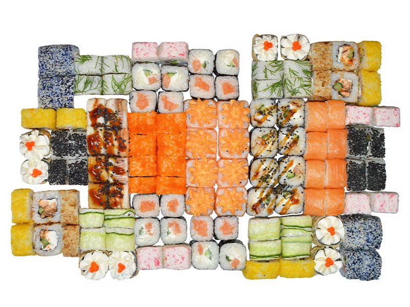 Сяке маки, аляска, бонито, калифорния, хот снежок, филадельфия, сяке урамаки, канада, филадельфия блэк, филадельфия с огурцом, кани фурай, лава премиум, унаги урамаки, ясай урамаки, фето маки (всего 15 роллов)