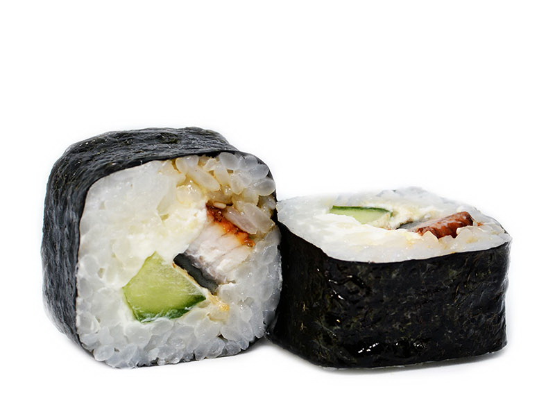 рис, нори, угорь копченый, сыр сливочный, соус унаги, огурец, кунжут