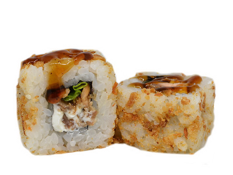 рис, нори, сыр, лосось терияки, лук зеленый, луковые хлопья, соус унаги